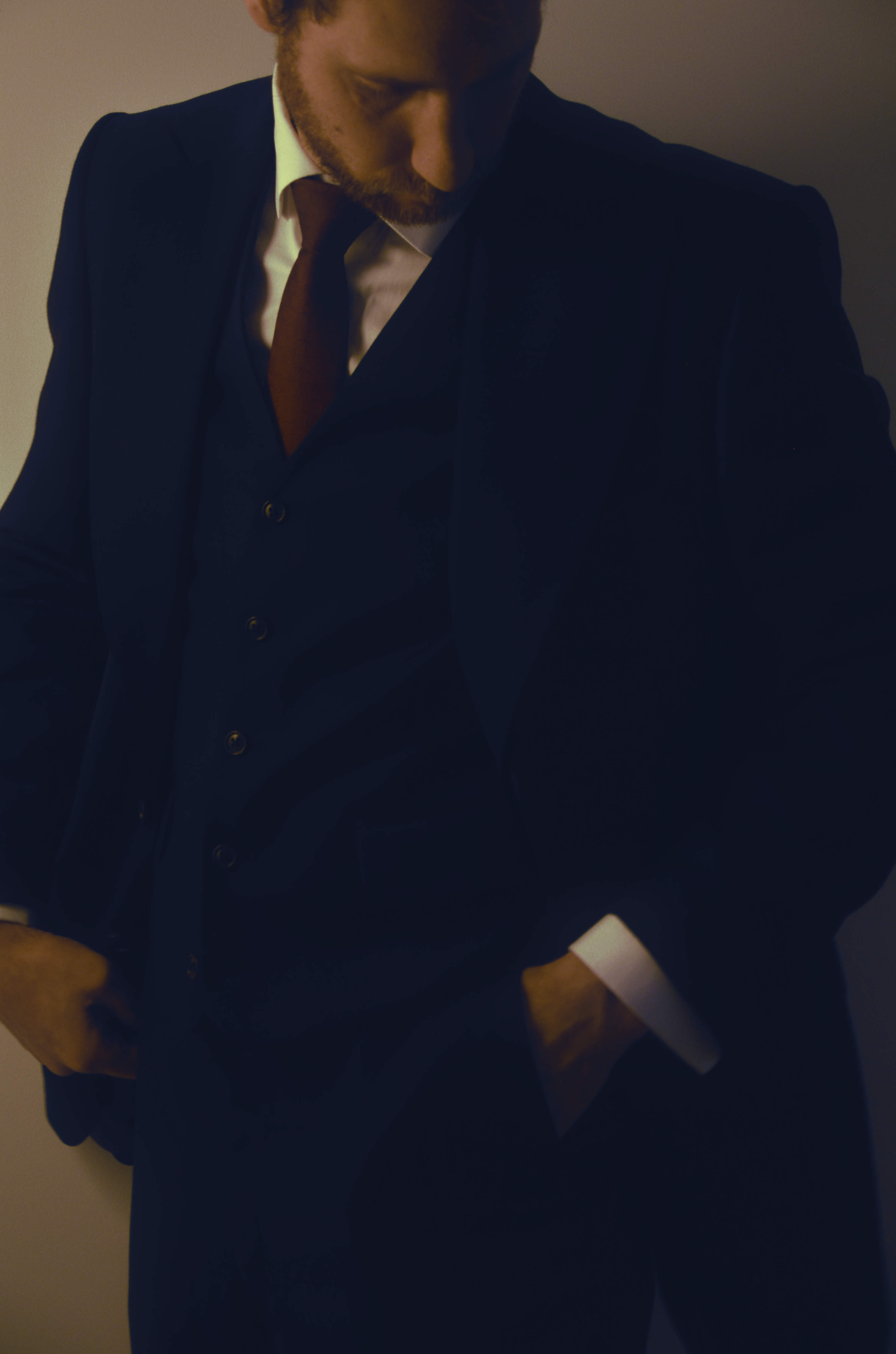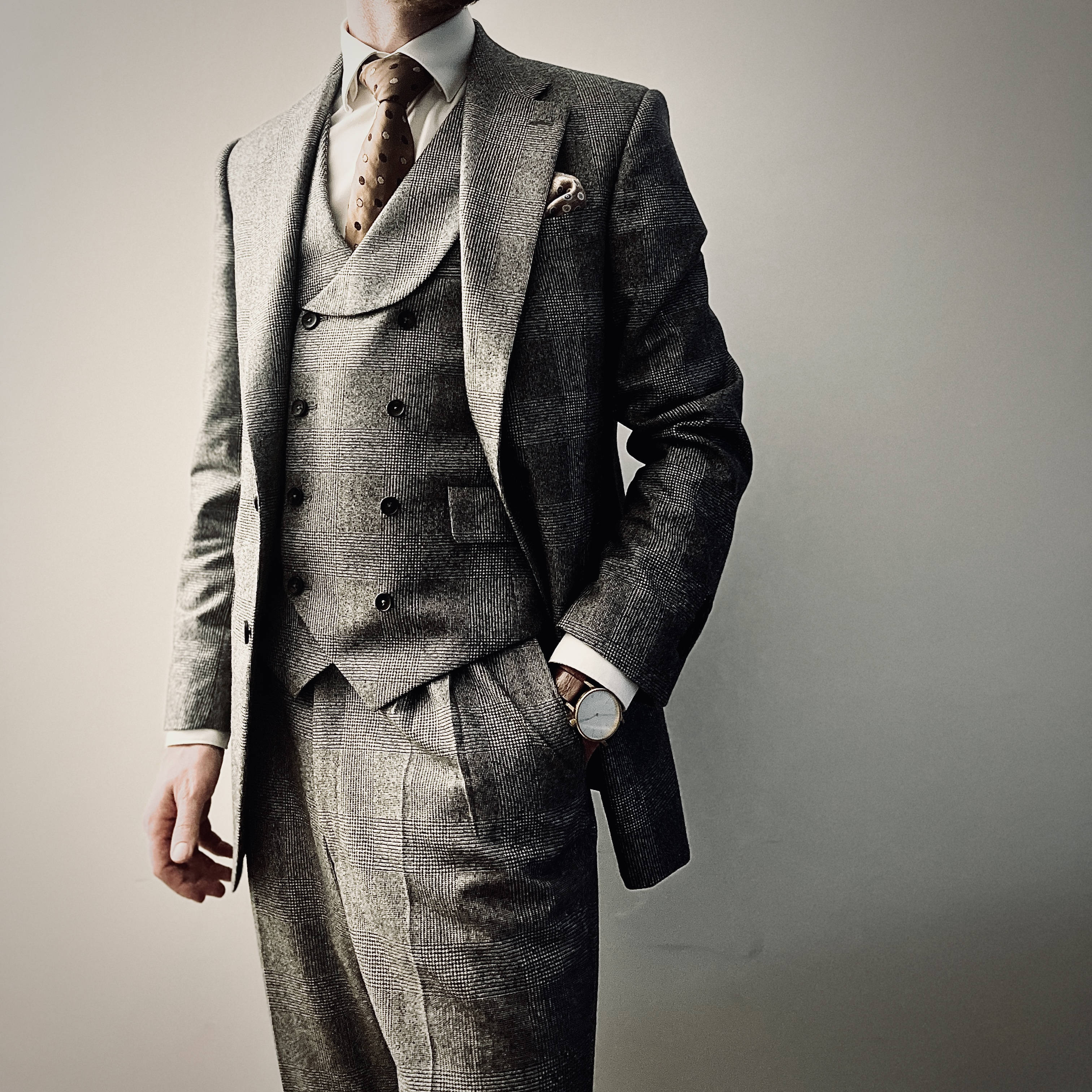 Onze huisstijl is gebaseerd op de Engelse snit en vertrekt vanuit structuur en uitgebalanceerde proporties. Zo werken we met een duidelijke schouderlijn die het jasje vorm en aanwezigheid geeft. Deze schouderconstructie draagt bij aan een sterke houding en een zelfverzekerde uitstraling, zonder hard of overdreven aan te voelen.